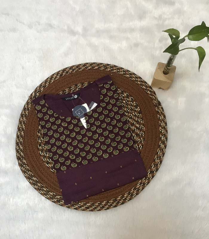 This is a cotton kurti with a wine base and small traditional printed motifs, giving it a simple and graceful ethnic look.