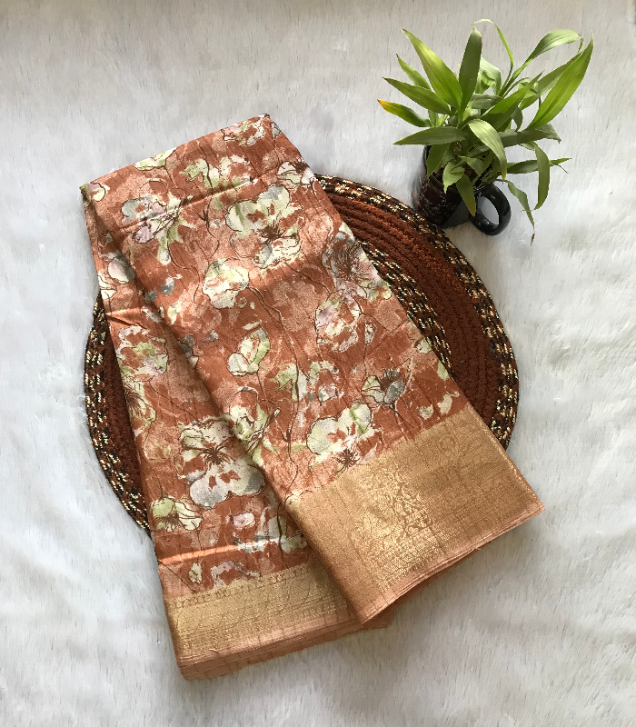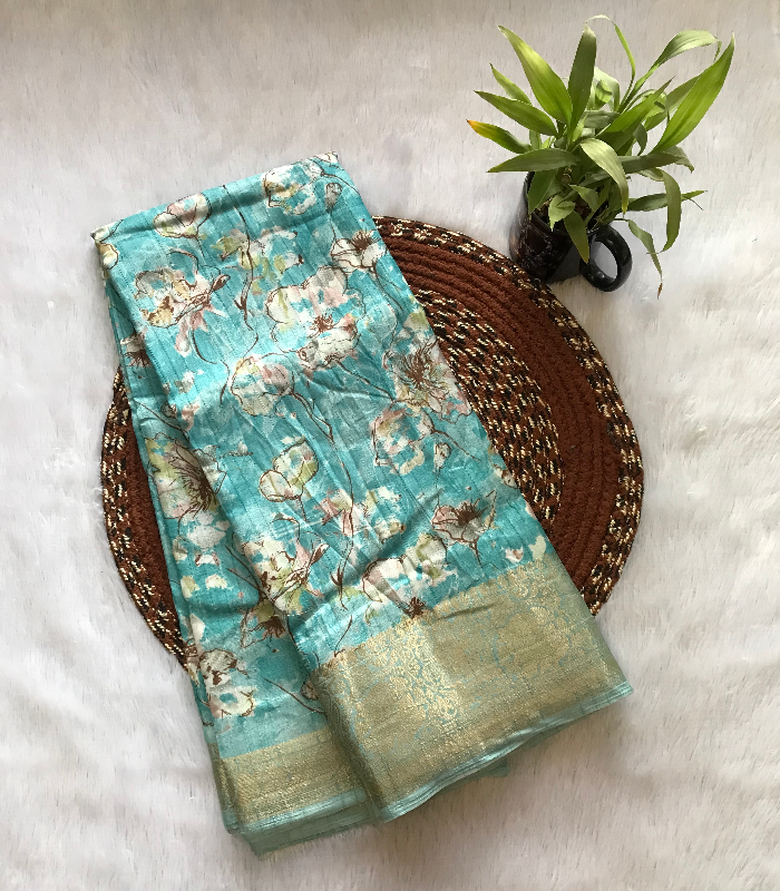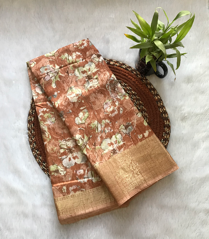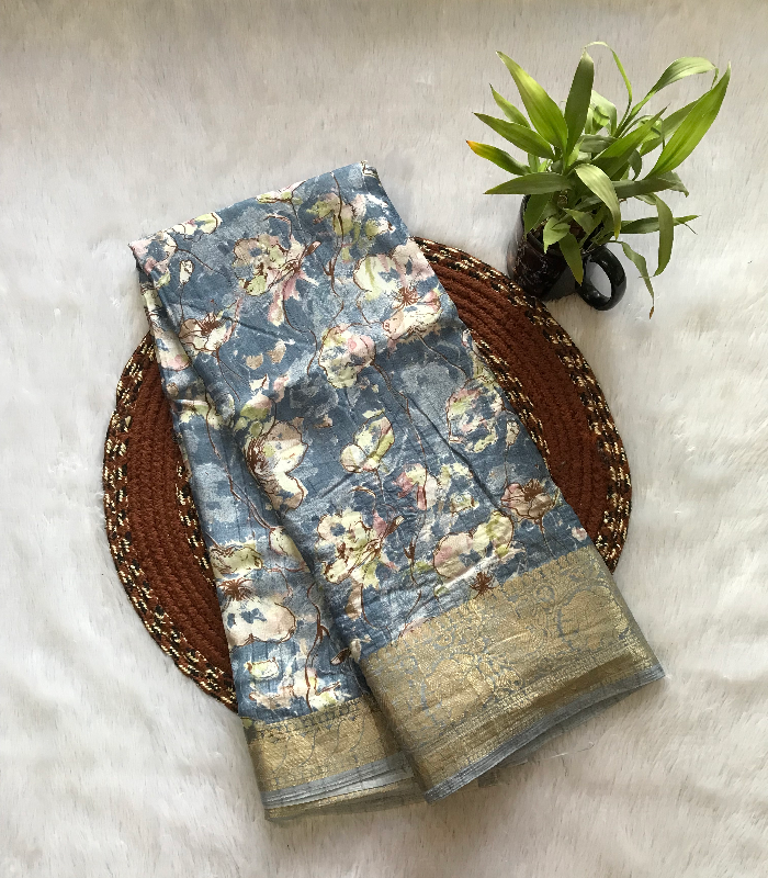 This saree features an elegant floral print with a subtle sheen and a rich woven border, giving it a graceful and festive look that is suitable for casual gatherings and special occasions.